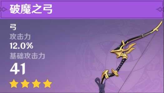 【破魔之弓】基础攻击454,副属性55.1%攻击力,武器特效提升普攻和重击伤害,满能量时效果翻倍。