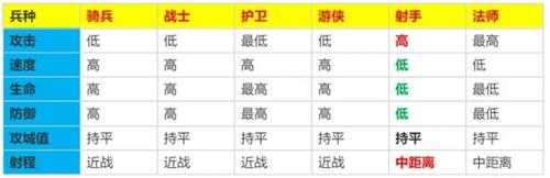 在搭配阵容前,我们首先要了解射手兵种的属性特点,这样才能扬长避短,针对性搭配。