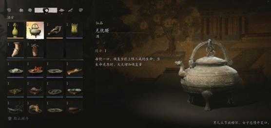 黑神话悟空游戏里除了各种武器装备或是法术一类可以收集外,还有一些酒品可以收集,不同种类的酒有不同的效果,可以盛放在葫芦里,本期将给大家分享的时仙品无忧醑的获取。