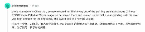 有意思的是,还有玩家知道中国的“十里坡剑神”梗:一位《仙剑》玩家因为找不到剧情点,在初始地区练了半年,直至71级。因为地点在十里坡,而李逍遥的最强技能名为“剑神”,故而得名“十里坡剑神”。