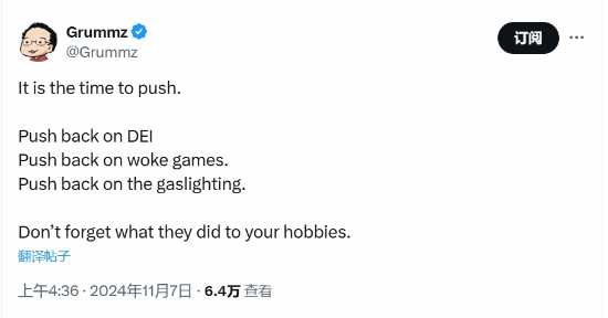 在当前游戏文化中充斥大量“觉醒”内容的当下,@Grummz一直担任着反抗者的角色,时常在社交媒体上发布抵制DEI和LGBTQ入侵游戏的内容。