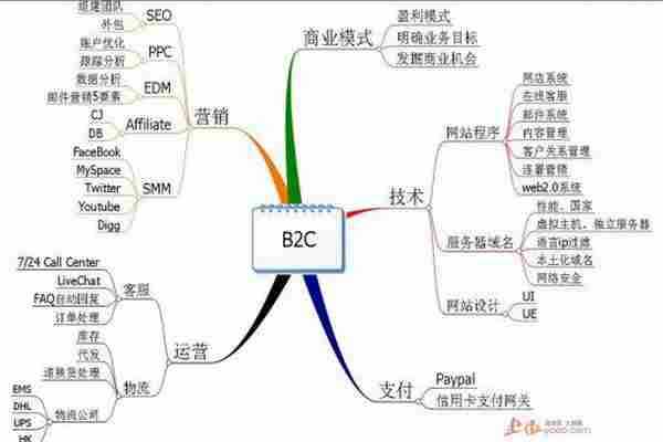 而这个“点”就是思维导图的一个基本核心要素——中心图,有了这个中心图就可以无限的拓展,网络创业者们可以透过思维导图的拓展性来开展自己的业务,也可以用思维导图来指引自己的运营思路,这样就可以把你的电子商务网站越做越强。接下来让我们来看一张B2C网站运营的思维导图。