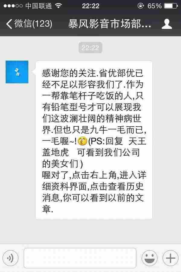 与同道大叔类似的,还有暴风影音市场部的2B们这个公众号,我粗略看了下,只有推送美女的这篇文章阅读量最高,达到了1000多,其他的基本都是500左右。