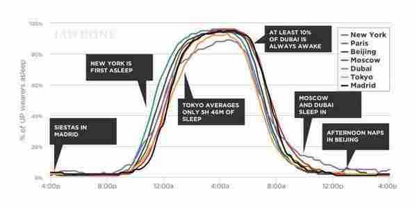 例如,智能手环厂商Jawbone日前就在自己的官方博客上发布了一组大数据图表,列出了全球数个大城市用户的睡眠和运动情况,包括纽约、巴黎、北京、莫斯科、迪拜、东京和马德里等城市。其中,日本东京是全球睡眠最短(5小时44分钟)的城市;“不夜之城”纽约人每晚的睡眠时间达6小时47分钟,不过,半数纽约用户直到凌晨两点还没休息;在阿联酋迪拜,10%的用户直到上午11点还在睡觉。