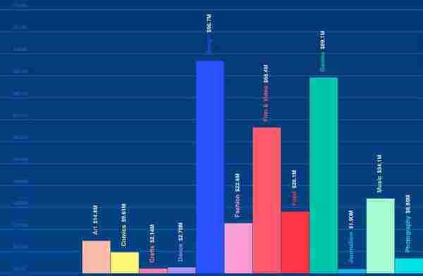 例如,当前最流行的重筹平台之一Kickstarter,在其网站上用数字和图表的形式介绍了2014“成绩单”。Kickstarter发起的众筹项目有很多类别,包括:艺术、电影、视频、出版、舞蹈、音乐、食物、游戏、科技、摄影等。如图所示,科技类虽项目总数落后于电影、音乐、艺术和设计等,但其筹到的资金数额却是最多的,达到1.25亿美元,约占2014年筹集到的资金总额的24%。