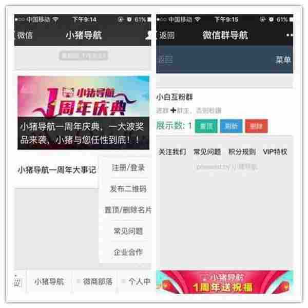 4、按照以上步骤添加好10个左右的群后,就是创建一个属于自己的群,在这里尽量是找两个人来一起帮忙了!否则自己一个人会有点手忙脚乱。当自己的群创建好之后,需要修改群的名字,群的名字可以修改为:500人小白互粉群、微商互粉群等等!并且修改好自己的群名字为:群主!最后回到小猪导航里,在底部栏里找到个人中心点击后选择“发布二维码”。
